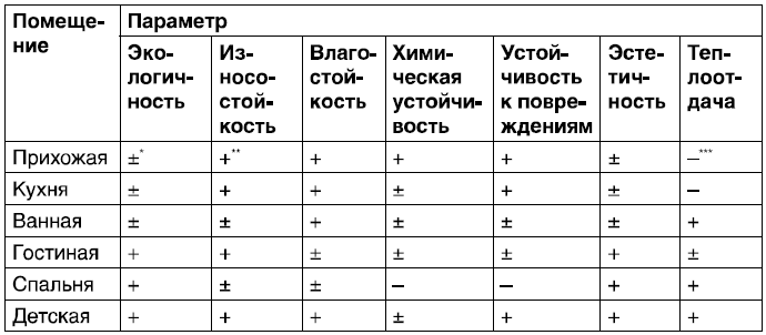 проходные и хозяйственные; гостиная; комнаты для отдыха.Исходя из этого, рассмотрим на таблице какими параметрами должен обладать материал в том или ином помещении: